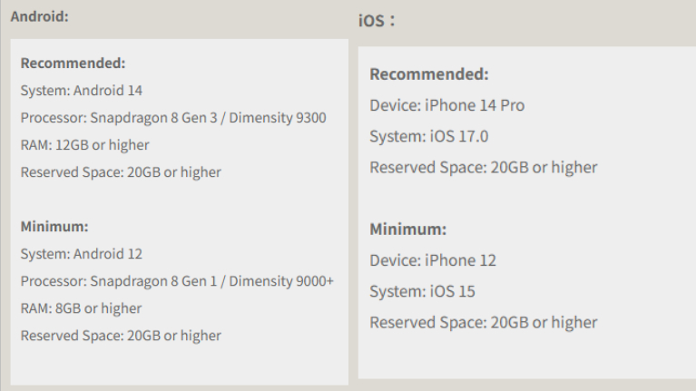 「Snapdragon 8 Gen 1」または「Dimensity 9000+」が最低ラインとして要求されています。これは、2022年頃のハイエンドモデルに搭載されていたSoC(CPU)であり、他の多くのゲームでは「推奨スペック」に分類されるほどの高性能チップです。