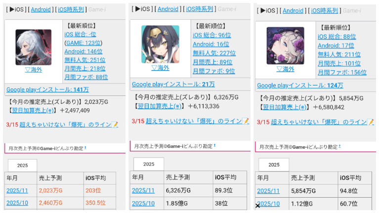 では、こうした低評価が、実際の売上にどれほど影響しているのでしょうか。ゲームの収益予測サイト「Game-i」のデータ(2025年11月5日時点)を基に、ほぼ同時期にリリースされた他の新作ソシャゲ2作品と、デュエットナイトアビスの初動データを比較してみましょう。