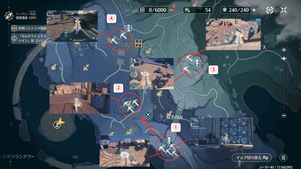 これら①から④のルートをすべて回ることで、1日に岩破壊で獲得できるシェルコインの上限、約25,000枚を回収できます。所要時間は移動を含めても約2分程度。スタミナを一切使わずにこれだけの金額を稼げるのは、金策として破格の効率と言えるでしょう。