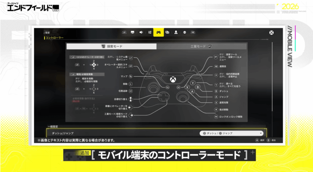 番組内で公開された開発中の画面(添付資料参照)では、スマホ版(MOBILE VIEW)の設定画面にはっきりと「コントローラー」の項目が存在し、Xboxコントローラーを使用したキーマッピングが表示されています。