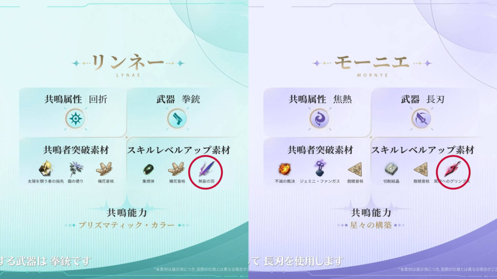 新キャラ「リンネー」「モーニエ」の育成素材について、週ボス素材は「無妄者」と「ヘカテー」(画像の赤丸)ですので、今から集めることが可能ですが、その他の育成素材は新マップ実装後となります。