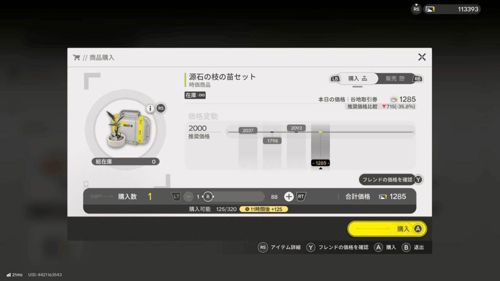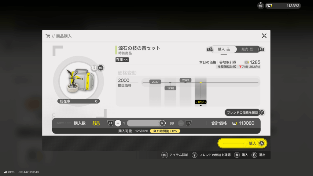 自分の端末で、安くなっている時価商品を限界まで購入します。今回は例として「源石の枝の苗セット」を88個購入したとしましょう。仕入れ値が1個あたり1285だとすると、合計で約113,080の出費です。一見高い買い物に見えますが、これは投資です。