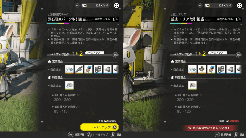 レベルアップ(Lv1→2)に必要な費用は50,000谷地取引券。購入可能回数は200から260へ増加。