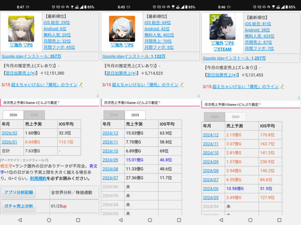 エンドフィールドはその中間、あるいは「やや好調なポジション」に位置しています。決して大衆全員に向けたお祭り騒ぎではありませんが、特定層からの支持を確実に集めており、今後のイベントやキャラクター実装次第でさらに順位を伸ばすポテンシャルを秘めています。