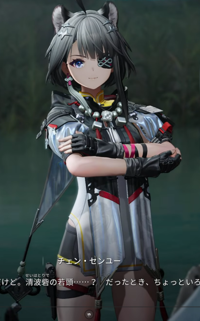 タンタンのキャラクターデザインで目を引くのが、右太ももに装着されたガンホルスターです。ストーリーの進行中、彼女が直接武器を構えるシーンはありませんでしたが、このホルスターの存在は「射撃武器」を使用する決定的な証拠と言えるでしょう。