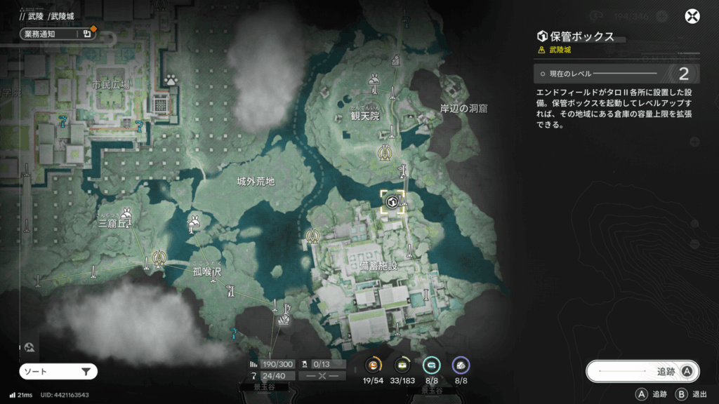 武陵の地形は起伏が激しいため、タワーの設置場所には工夫が必要です。中継タワー同士の接続が切れないように、視界の通る高い位置などを選びながら、慎重に電力ラインを伸ばしていきましょう。電力が通って初めて、保管ボックスの機能解放やレベルアップが可能になります。この作業は少し手間がかかりますが、一度繋いでしまえば恒久的に利用できるため、最初にしっかりと整備しておく価値があります。