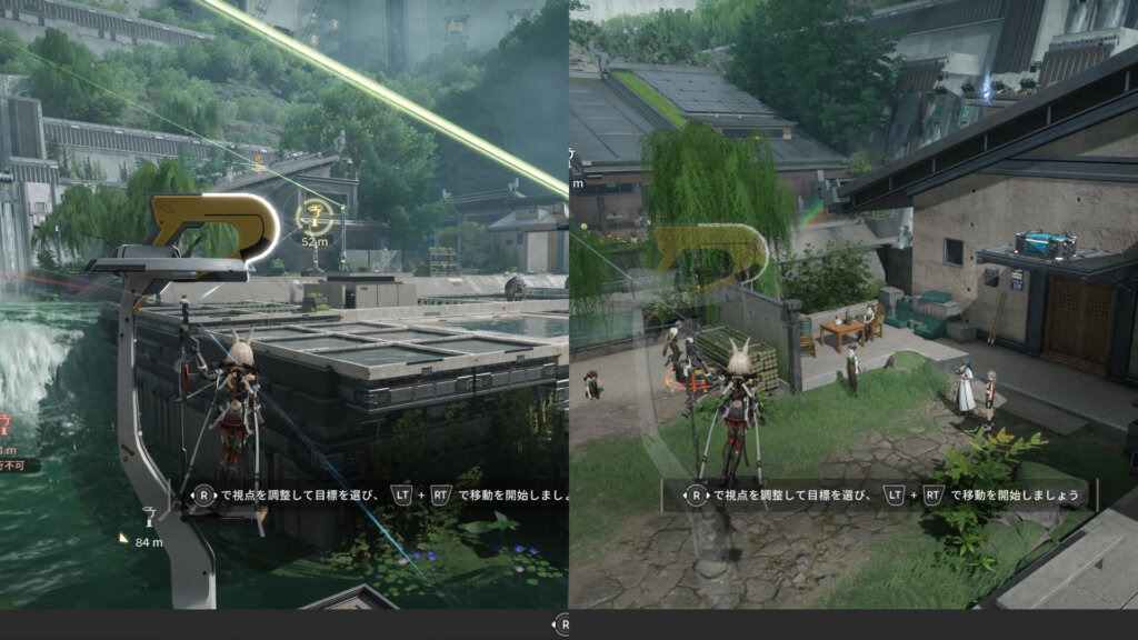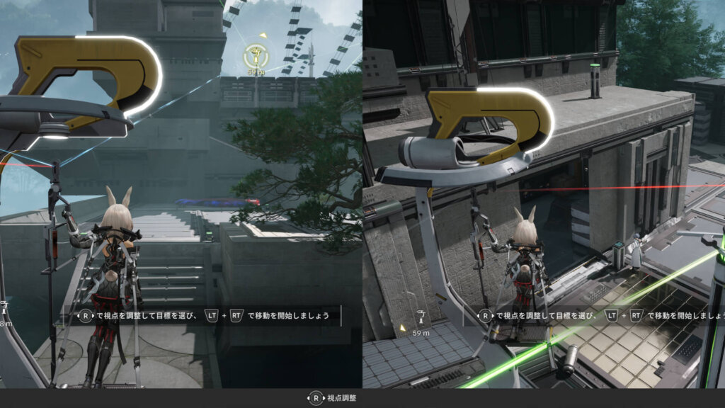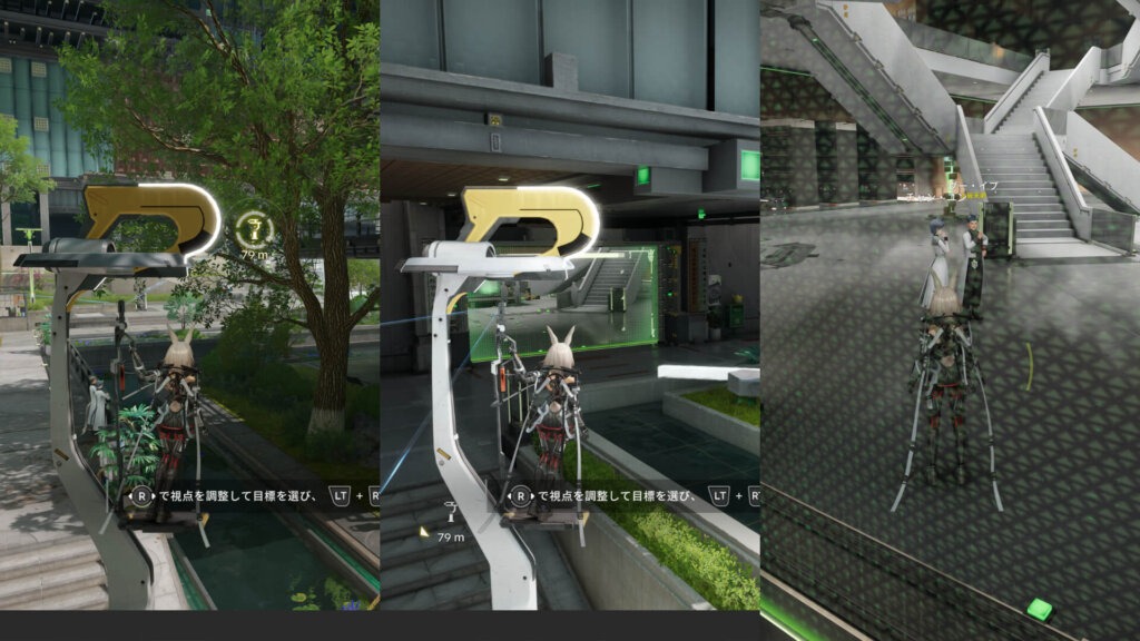 観天院のワープポイント付近にジップラインの支柱を立て、そこから保管ボックスのすぐ近くまで一本線を引くように設置します。これで任務開始時の移動が数秒で終わります。