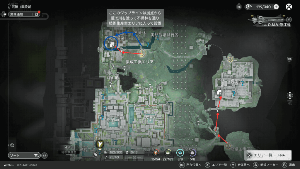 保管ボックスを無事に解放できたら、次はいよいよ配達任務の効率化です。配達任務は繰り返し行うことになるため、毎回徒歩で移動していては時間がいくらあっても足りません。そこで活躍するのが「ジップライン」です。ここでは、武陵の地形に合わせた最適なジップラインの配置例を紹介します。