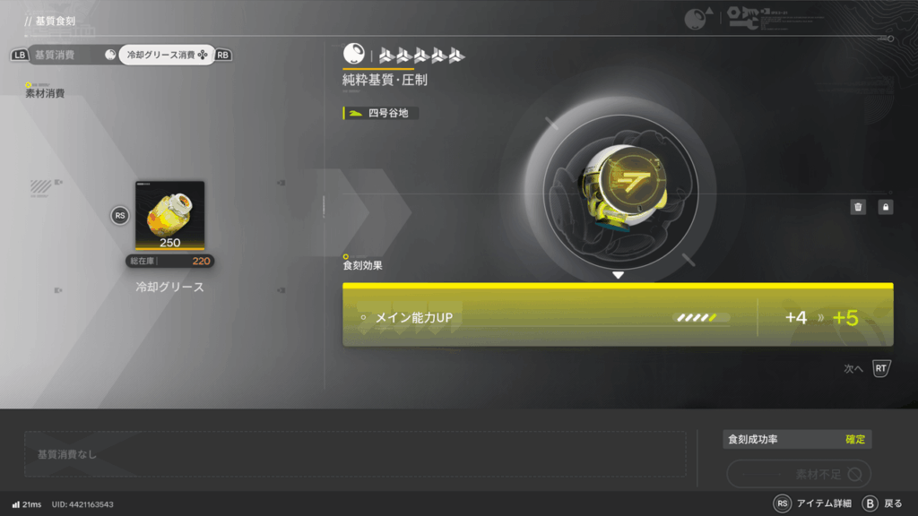 食刻の成功率はステータスが高くなるほど低下するため、重要な基質には冷却グリースを使って確実に強化することをおすすめします。冷却グリース250個で確定でステータスが上昇するので、コツコツ貯めておきましょう。