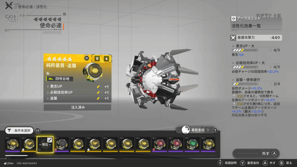 使命必達の場合、スキルロック(ゲーム内では「スキル効果」)を「追襲」に設定すると、他に4つの武器と同時厳選が可能になります。(緑色で表示され、スキルが3/3)。基礎効果はギルベルタの使命必達「意志UP」を中心に、同時厳選できる「筋力UP」「知性UP」を選択すれば、複数の武器の理想基質を一度に狙えるわけです。