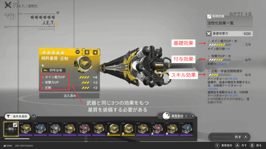 基質には「基礎効果」「付加効果」「スキル効果」の3つの要素があり、それぞれが武器やオペレーターの特性に合致することで真価を発揮します。例えば、攻撃型のオペレーターには攻撃力や会心率を高める基質が、防御型には耐久力を上げる基質が適しているわけです。