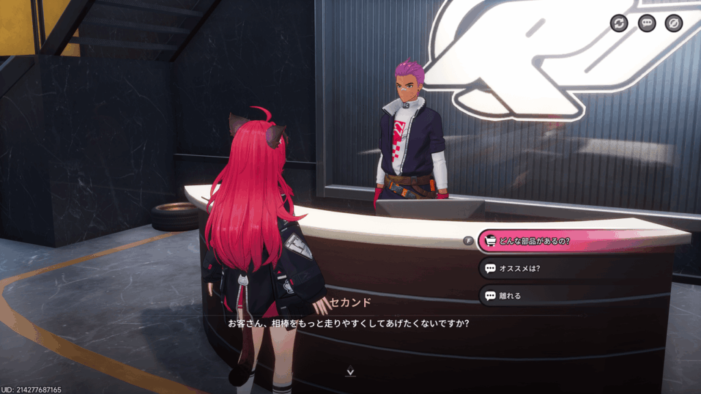 店舗に到着したら、受付にいる店員のに話しかけることでメニューが開きます。会話の選択肢の中から「どんな部品がある?」を選ぶと、詳細な車両管理画面へと移行します。