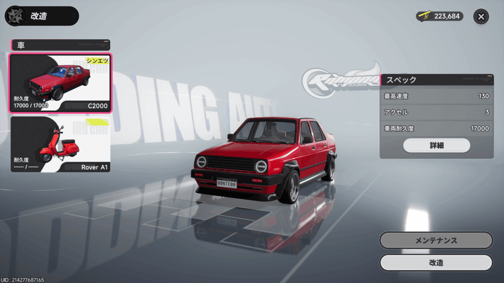 この画面には「メンテナンス」と「改造」の2つのボタンが用意されています。修理を行いたい場合は、迷わず「メンテナンス」を選択すれば、その場で車両の耐久度を最大まで回復させることが可能です。