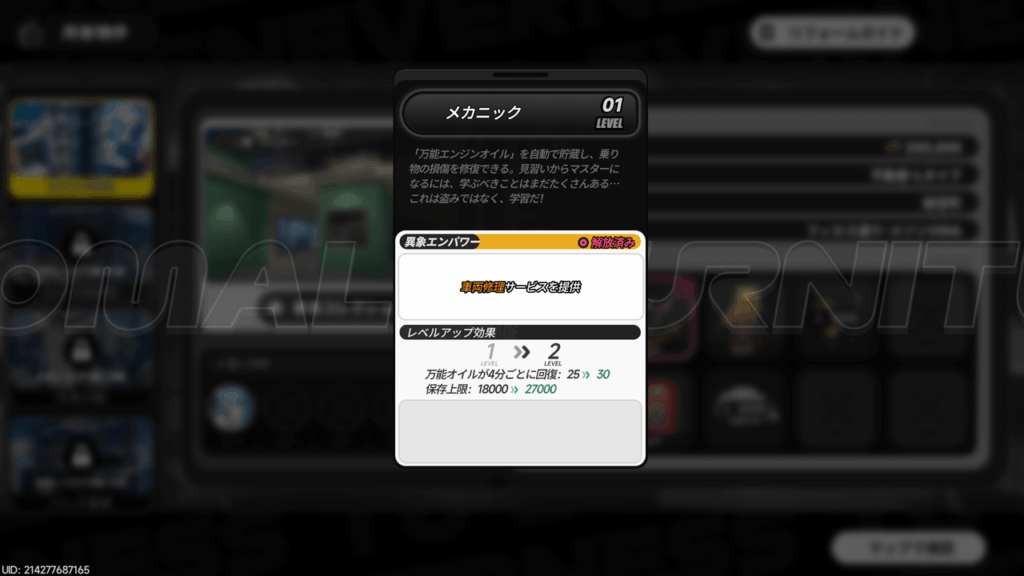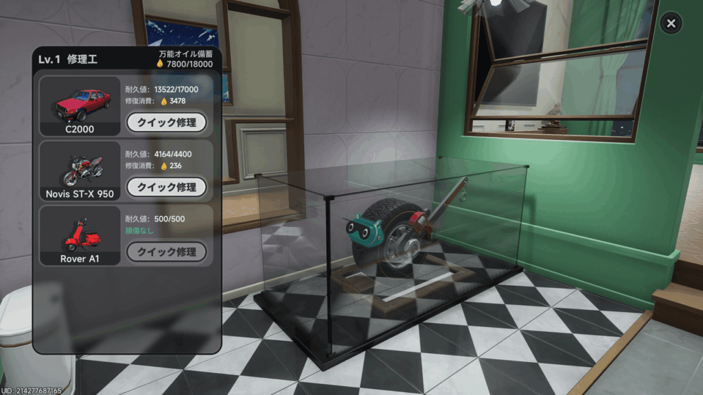 自宅での修理に使用するのは、ショップで使う通貨ではなく、時間経過で自動的に蓄積される「万能エンジンオイル」です。レベル1状態で、このオイルは4分ごとに25ユニットずつ回復し、レベル1の状態でも最大18,000ユニットまで貯めることができます。