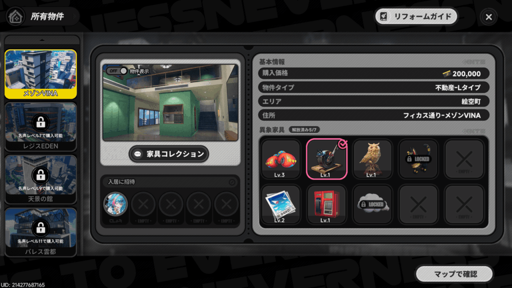 ゲームを進めて自分の不動産(マンションや部屋)を手に入れると、自宅での車両修理が可能になります。そのためには、まず不動産の管理画面から「異象家具」のセクションを開き、特定の家具を配置する必要があります。