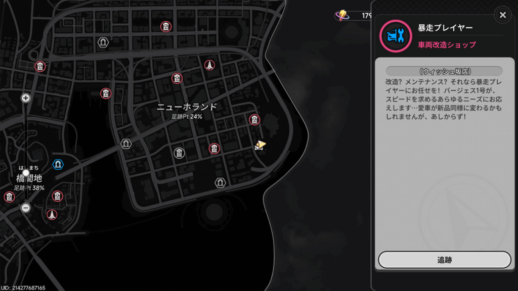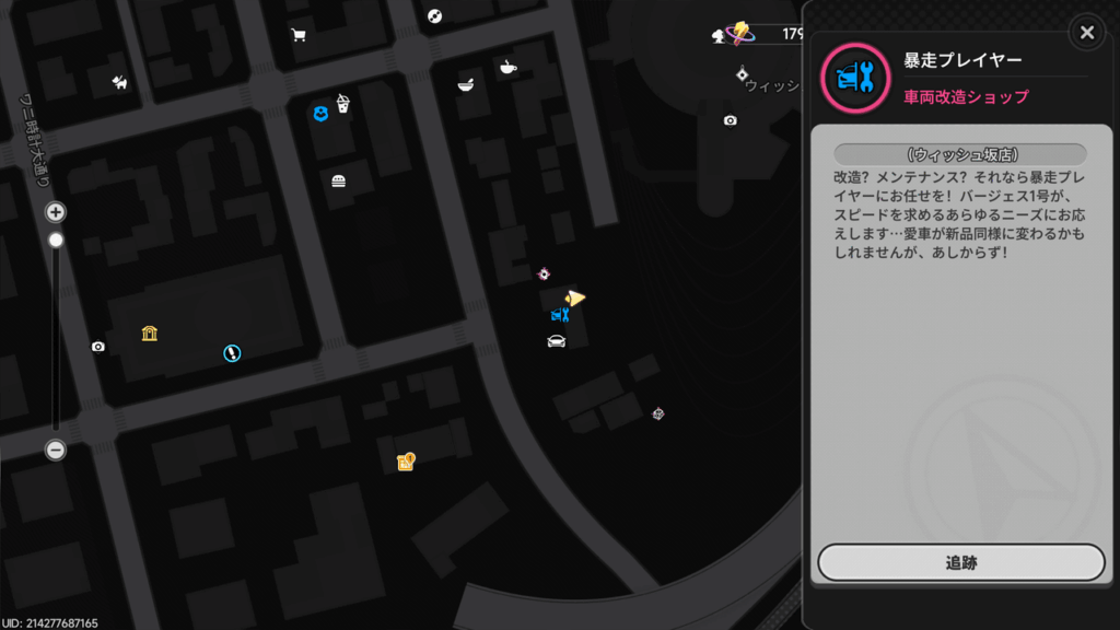 街中で車が壊れてしまった際に最も頼りになるのが、車両改造ショップである「暴走プレイヤー」です。マップ上では、車に工具(スパナ)が重なった青いアイコンで表示されているため、これを目印に移動してください。